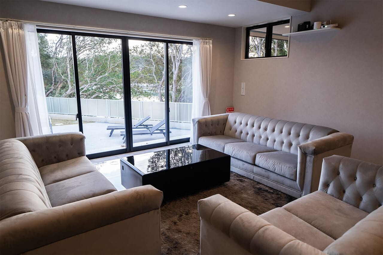 | 客室設備 | 洗浄機能付きトイレ、バスルーム、洗面台、BBQコンロ、冷凍冷蔵庫、IHコンロ、システムキッチン、電気ケトル(BALMUDA社製)、炊飯器(BALMUDA社製)、ドライヤー、ヘアアイロン |